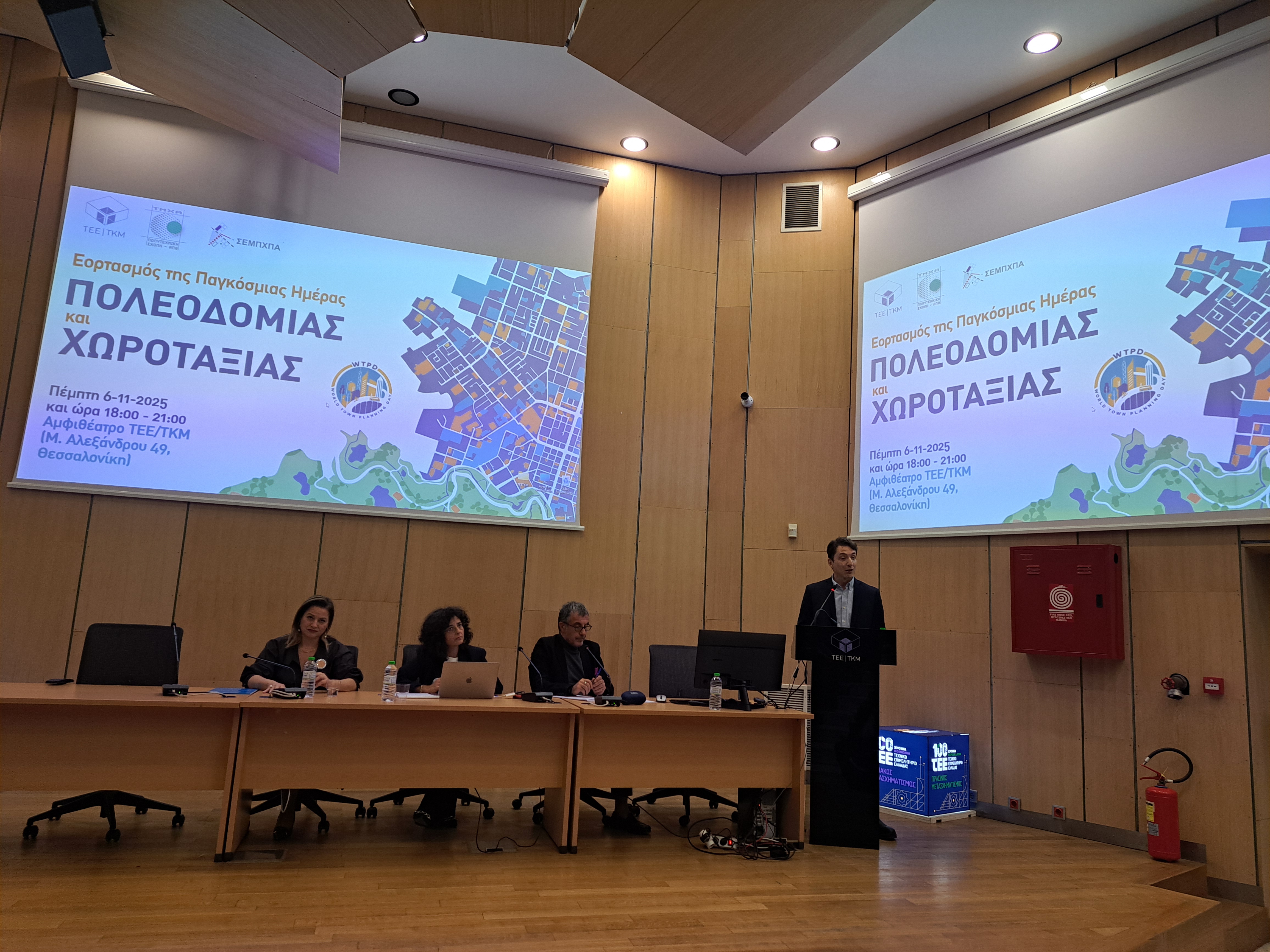Με μεγάλη επιτυχία πραγματοποιήθηκε το απόγευμα της Πέμπτης 6 Νοεμβρίου 2025, εκδήλωση με αφορμή την Παγκόσμια Ημέρα Πολεοδομίας–Χωροταξίας, την οποία συνδιοργάνωσαν ο Σύλλογος Ελλήνων Μηχανικών Πολεοδομίας, Χωροταξίας και Περιφερειακής Ανάπτυξης/ Περιφερειακό Τμήμα Βορείου Ελλάδος (ΣΕΜΠΧΠΑ/ ΠΤΒΕ) με το Τεχνικό Επιμελητήριο Ελλάδας/Τμήματος Κεντρικής Μακεδονίας (ΤΕΕ/ΤΚΜ) και το Τμήμα Μηχανικών Χωροταξίας και Ανάπτυξης/ ΑΠΘ, στο αμφιθέατρο του Επιμελητηρίου στη Θεσσαλονίκη.